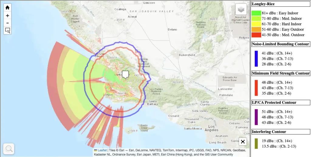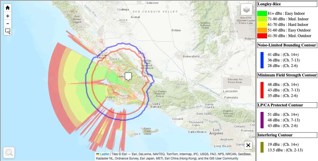 La cobertura del canal está basada en estudios Longley-Rice y contornos oficiales de transmisión, utilizados por la FCC para la planificación y protección del espectro.